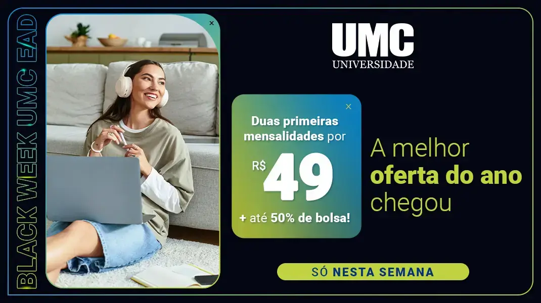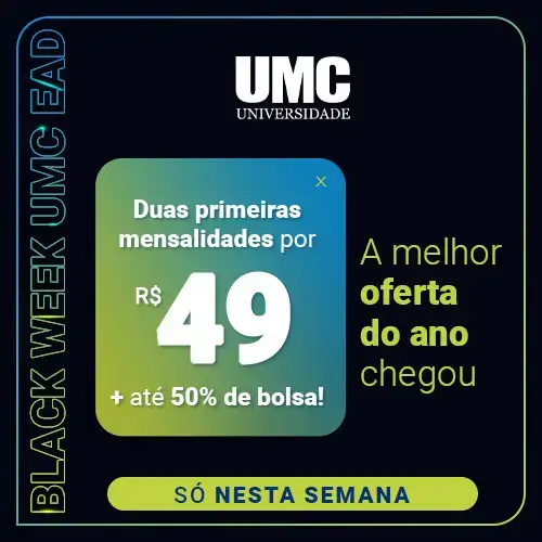 Durante a Black Week UMC EAD, você garante as duas primeiras mensalidades por apenas R$49 e ainda bolsas de até 50% durante todo o curso.